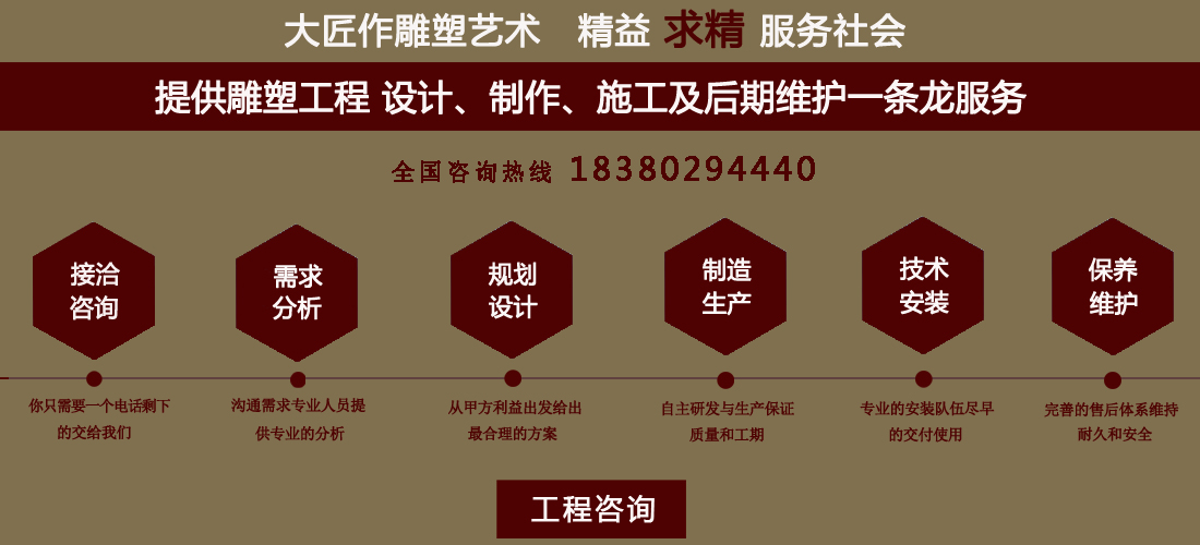 成都大匠作雕塑有限公司,是經(jīng)成都工商局審定注冊的正規(guī)專業(yè)雕塑制作及工程安裝服務(wù)機(jī)構(gòu),是由一群年輕富有朝氣的年輕人創(chuàng)辦,發(fā)軔于四川省成都市龍泉驛區(qū)。它是一家******于創(chuàng)作、制作和銷售為一體的公司。大匠作擁有多年從事公共藝術(shù)的專業(yè)人員和雕塑制作人組成的核心團(tuán)隊(duì),為您提供專業(yè)、具創(chuàng)新的設(shè)計(jì)及制作服務(wù)。公司成立以來,秉承“******服務(wù)、誠信為本”的宗旨,以客戶需求為目標(biāo)導(dǎo)向,不斷學(xué)習(xí),進(jìn)取,優(yōu)化和提高服務(wù)質(zhì)量,公司向您******——“您的滿意***是我們的信譽(yù)”,我們將以飽滿的熱情和******的服務(wù)贏得您的贊譽(yù)和支持。 愛心,細(xì)心,耐心,責(zé)任心是我們的要求,盡心盡職,為您打造出創(chuàng)新、專業(yè)、******的設(shè)計(jì)方案,我們堅(jiān)信先做人、后做事,用心對(duì)待客戶,實(shí)行透明收費(fèi),人性化服務(wù),本著對(duì)客戶負(fù)責(zé),對(duì)客戶負(fù)責(zé),更是對(duì)自己發(fā)展負(fù)責(zé)的態(tài)度,爭取做到讓每位客戶滿意